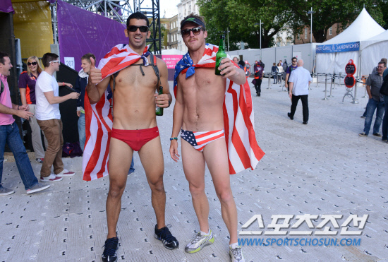 2일 호스 가드 퍼레이드에 설치된 런던 올림픽 비치발리볼 경기장 밖에서 미국 응원단이 수영복 차림에 성조기를 두르고 미국의 승리를 자축하고 있다. 미국이 2-1로 승리. 20120802. 런던=올림픽사진공동취재단b