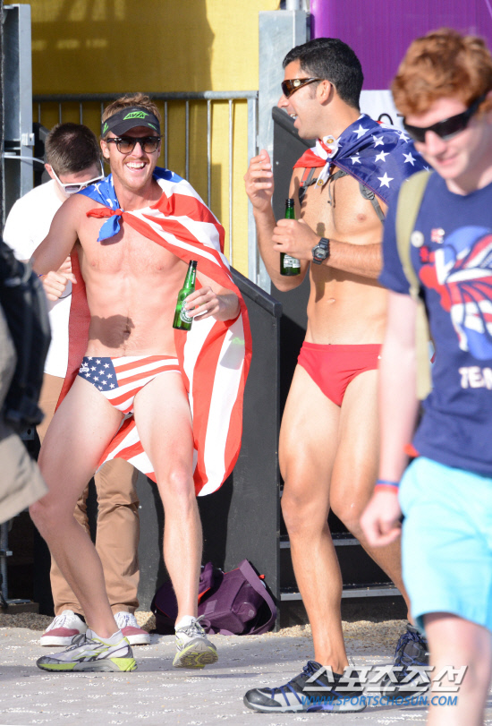 2일 호스 가드 퍼레이드에 설치된 런던 올림픽 비치발리볼 경기장 밖에서 미국 응원단이 수영복 차림에 성조기를 두르고 미국의 승리를 자축하고 있다. 미국이 2-1로 승리. 20120802. 런던=올림픽사진공동취재단b