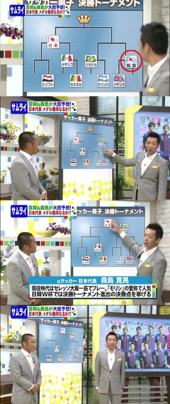 여기서 모리시마는 한국과 영국연합팀의 8강전에 대해 "영국이 홈어드밴티지에도 불구하고 전력이 그다지 강하지 않다. 역대 최강 전력인 한국의 깜짝 승리가 예상된다"면서 한국을 4강에 올려놨다. 하지만 4강전에서는 강호 브라질을 만나 패할 것으로 전망했다.