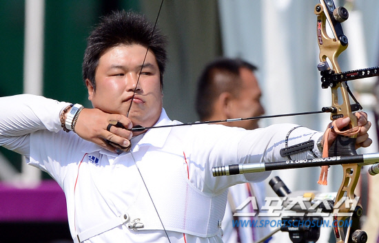 | 26일 오전(현지시간) 2012런던올림픽에 출전하는 한국 양궁 남자 국가대표 오진혁 선수가 런던 로즈 크리켓 그라운드 연습장에서 훈련을 하고 있다. 런던=올림픽사진공동취재단 |