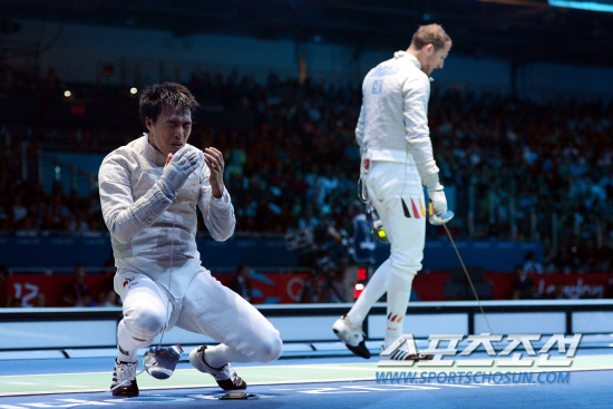 3일 영국 엑셀 런던 사우스 아레나에서 열린 런던올림픽 펜싱 남자단체 사브르 한국과 독일의 8강에서 한국의 원우영 선수가 준결승에 진출하는 공격을 성공시킨뒤 환호하고 있다./20120803런던=올림픽사진공동취재단g
