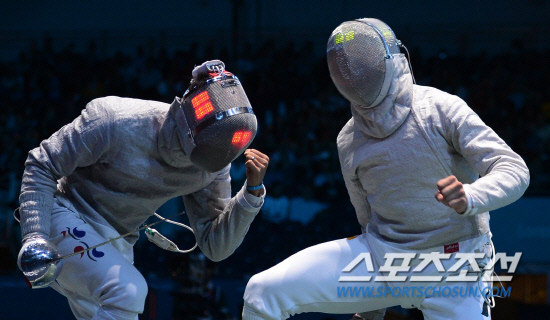 3일 영국 엑셀 런던 사우스 아레나에서 열린 런던올림픽 펜싱 남자단체 사브르 한국과 독일의 8강에서 한국의 김정환 선수가 공격을 성공시킨뒤 환호하고 있다./20120803런던=올림픽사진공동취재단g