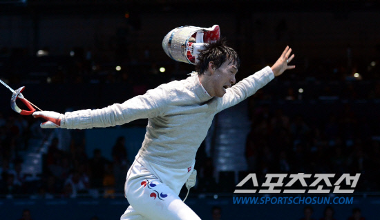 3일 영국 엑셀 런던 사우스 아레나에서 열린 런던올림픽 펜싱 남자단체 사브르 한국과 이탈리아의 준결승에서 한국의 원우영 선수가 결승행을 확정짓고 환호하고 있다./20120803런던=올림픽사진공동취재단g