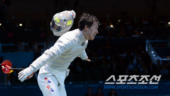 3일 영국 엑셀 런던 사우스 아레나에서 열린 런던올림픽 펜싱 남자단체 사브르 한국과 이탈리아의 준결승에서 한국의 원우영 선수가 결승행을 확정짓고 환호하고 있다./20120803런던=올림픽사진공동취재단g