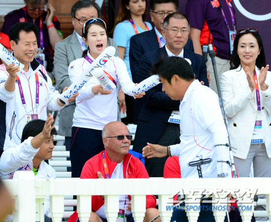 2012 런던올림픽 양궁대표팀의 오진혁이 3일(현지시간) 런던의 로즈 크리켓 그라운드에서 열린 남자 양궁 개인 8강전에서 우크라이나의 빅터 루반과 대결해 승리한 뒤 선수 관람석을 지자치자 여자 양궁 개인전 금메달을 목에 건 기보배와 박종길 태릉선수촌장 등이 뜨거운 응원을 보내고 있다.