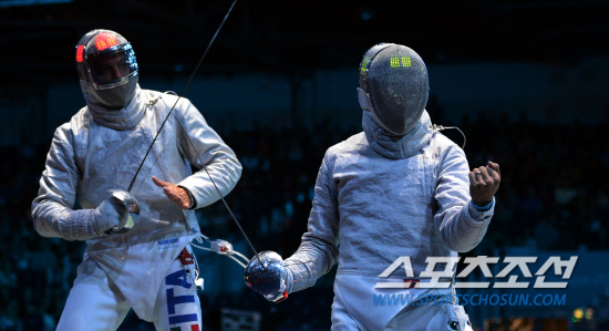 3일 영국 엑셀 런던 사우스 아레나에서 열린 런던올림픽 펜싱 남자단체 사브르 한국과 이탈리아의 준결승에서 한국의 김정환 선수(오른쪽)가 공격을 성공시킨뒤 환호하고 있다./20120803런던=올림픽사진공동취재단g