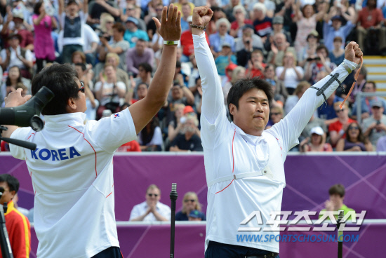 2012 런던올림픽 양궁대표팀의 오진혁이 3일(현지시간) 런던의 로즈 크리켓 그라운드에서 열린 남자 양궁 개인 4강전에서 중국의 다이오샹을 꺽고 결선 진출을 확정지은 뒤 환호하고 있다.