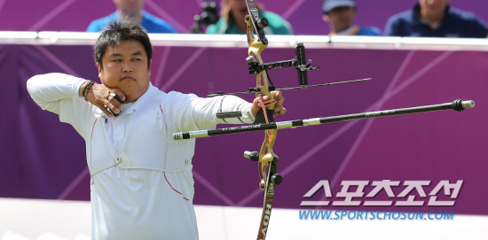 런던올림픽 개막 8일째인 3일 오후(현지시각) 남자 양궁 개인전에 출전한 한국의 오진혁이 런던 로드 크리켓 가든에서 열린 준결승에서 활을 쏘고 있다. 오진혁은 슛오프까지 가는 접전 끝에 중국의 시아오시앙 다이를 누르고 결승에 진출했다.