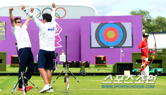 개인전 첫 금메달에 도전하는 남자 양궁 대표팀이 3일 런던 로즈크리켓 그라운드에서 남자 양궁 개인전을 펼쳤다. 오진혁이 결승전에 진출했다. 4강전에서 승리가 확정되자 환호하고 있는 오진혁.