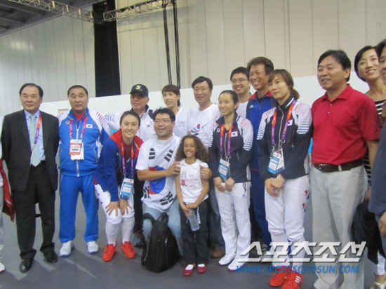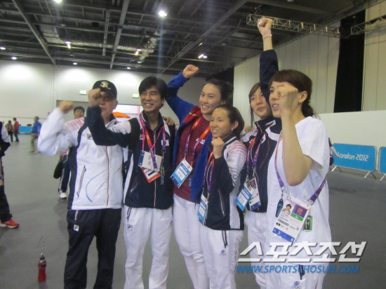 "아, 기분이 너무 좋아, 날아갈 것같아!" 여자펜싱 플뢰레 대표팀의 막내 오하나(27·성남시청)가 폴짝 뛰어올랐다. 3일(한국시각) 런던올림픽 여자펜싱 플뢰레 단체전 3-4위전에서 프랑스를 45대32로 완파하고 동메달을 따낸 직후다. 한국 펜싱 사상 최초의 단체전 올림픽 메달이다. 개인전에서 메달을 놓치고 마음고생이 심했던 남현희(31·성남시청)가 최명진 여자펜싱 코치와 뜨겁게 포옹했다. 전희숙(28·서울시청), 정길옥(32·강원도청) 등 선수들이 어깨동무를 한 채 어디론가 바쁘게 움직였다. 경기장을 빠져나오자마자 이내 야구모자를 쓴 노신사를 향해 신나게 달려갔다. 얼싸안으며 기뻐하는 모습이 부녀지간처럼 다정했다. 대한펜싱협회장을 맡고 있는 손길승 SK텔레콤 명예회장이었다.