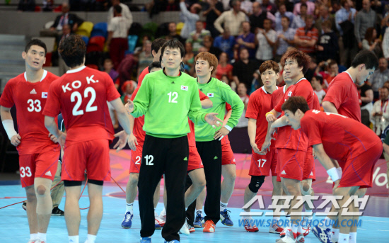◇1일(한국시각) 영국 런던 코퍼박스에서 열린 2012년 런던올림픽 남자 핸드볼 예선 B조 2차전에서 한국 선수단이 헝가리에 19대22로 패한 뒤 아쉬워 하고 있다. 런던=올림픽사진공동취재단