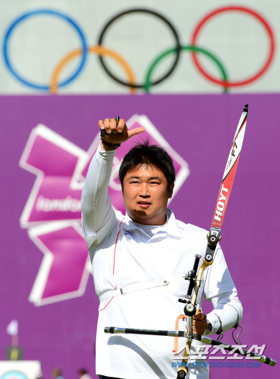 개인전 첫 금메달에 도전하는 남자 양궁 대표팀이 3일 런던 로즈크리켓 그라운드에서 남자 양궁 개인전을 펼쳤다. 오진혁이 금메달을 획득했다. 결승전에서 승리가 확정되자 기뻐하고 있는 오진혁.