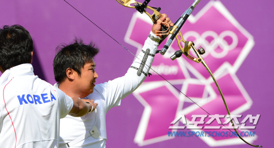 개인전 첫 금메달에 도전하는 남자 양궁 대표팀이 3일 런던 로즈크리켓 그라운드에서 남자 양궁 개인전을 펼쳤다. 오진혁이 금메달을 획득했다. 결승전에서 승리가 확정되자 기뻐하고 있는 오진혁.