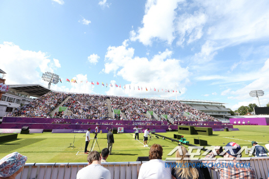 런던올림픽 개막 8일째인 3일 오후(현지시각) 남자 양궁 개인전에 출전한 한국의 오진혁이 런던 로드 크리켓 가든에서 일본의 후루카와 다카하루와 결승전을 펼치고 있다.