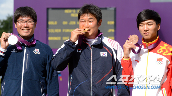 3일 오후(현지시간) 런던 로즈 크리켓 그라운드에서 열린 남자 양궁 개인전에서 금메달을 딴 오진혁 선수가 시상식을 마친후 금 맛을 보고 있다.20120803런던=올림픽사진공동취재단L