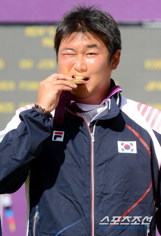 3일 오후(현지시간) 런던 로즈 크리켓 그라운드에서 열린 남자 양궁 개인전에서 금메달을 딴 오진혁 선수가 시상식을 마친후 금 맛을 보고 있다.20120803런던=올림픽사진공동취재단L