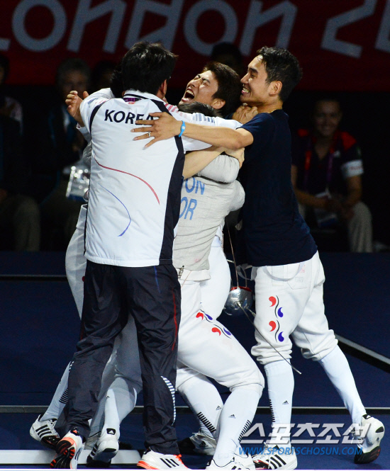 한국 남자 사브르 대표팀이 4일 새벽(한국시간) 영국 런던 엑셀 경기장에서 열린 2012 런던올림픽 남자 단체전 결승전서 우승을 확정지은후 부둥켜안고 환호하고 있다. 한국 올림픽 출전 사상 100번째 금메달이 확정되는 순간이다.