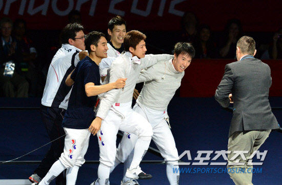 한국 남자 사브르 대표팀이 4일 새벽(한국시간) 영국 런던 엑셀 경기장에서 열린 2012 런던올림픽 남자 단체전 결승전서 우승을 확정지은후 환호하고 있다. 한국 올림픽 출전 사상 100번째 금메달이 확정되는 순간이다.