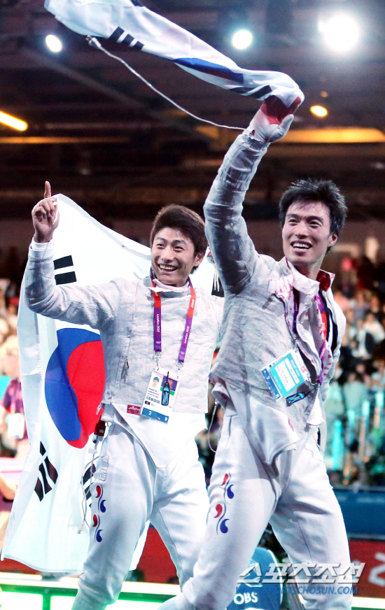 남자 단체 사브르 대표팀이 3일(현지시간) 오후 영국 런던 엑셀 경기장에서 열린 2012 런던올림픽 남자 사브르 단체전 결승전에서 루마니아팀을 이겨 사상 처음으로 올림픽 단체전 결승전에서 루마니아에 45-26으로 승리를 거둔후 오은석(좌)과 원우영(우)이 환호하고 있다.