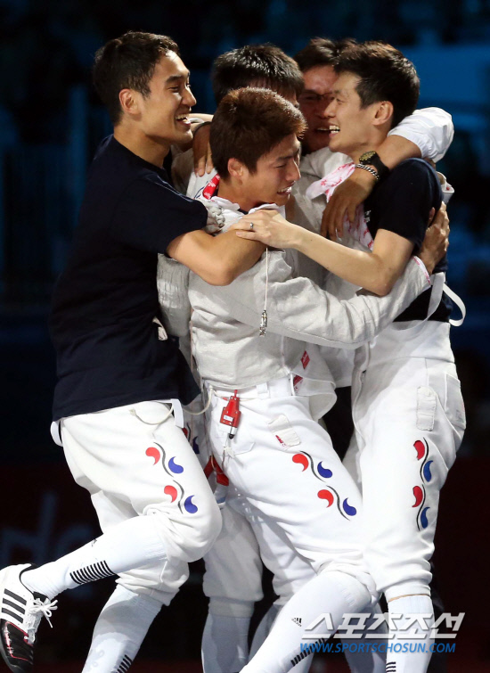 한국 남자 펜싱 사브르 대표팀 선수들이 4일 영국 런던 사우스 아레나에서 열린 2012 런던올림픽에서 단체전을 승리한후 환호하고있다.. 왼쪽부터김정환,오은석,원우영,김용율총감독,구본길.