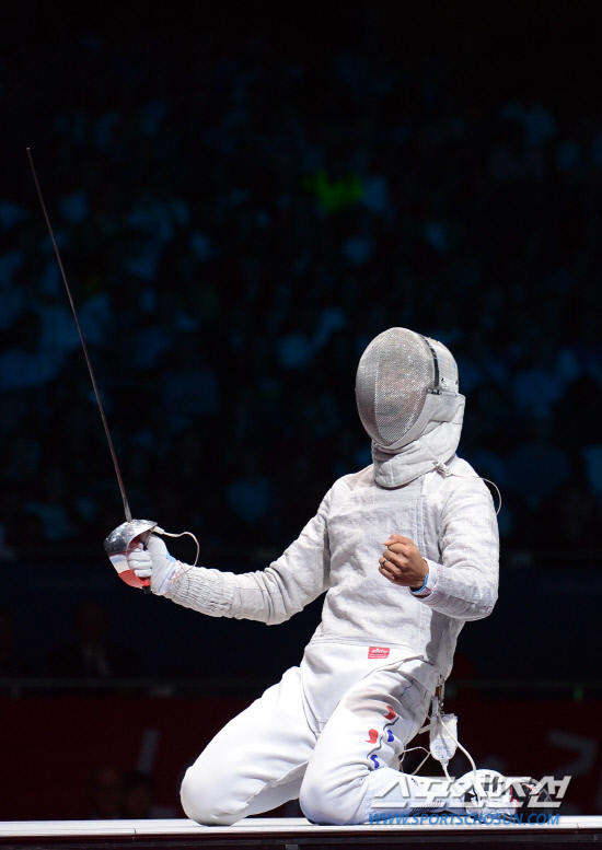 3일 영국 엑셀 런던 사우스 아레나에서 열린 런던올림픽 펜싱 남자단체 사브르 한국과 루마니아와의 결승에서 한국의 김정환 선수가 공격을 성공시킨뒤 환호하고 있다./20120803런던=올림픽사진공동취재단g