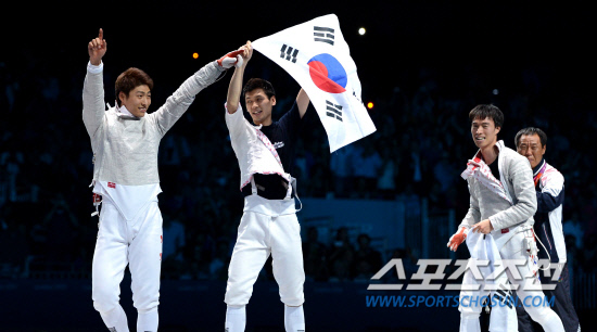 [런던포토] 태극기 펼쳐든 남자펜싱, '우리가 챔피언이예요!'