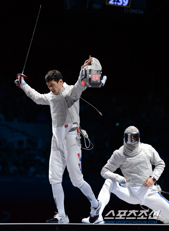 3일 영국 엑셀 런던 사우스 아레나에서 열린 런던올림픽 펜싱 남자단체 사브르 한국과 루마니아와의 결승에서 한국의 구본길 선수가 공격을 성공시킨뒤 환호하고 있다./20120803런던=올림픽사진공동취재단g