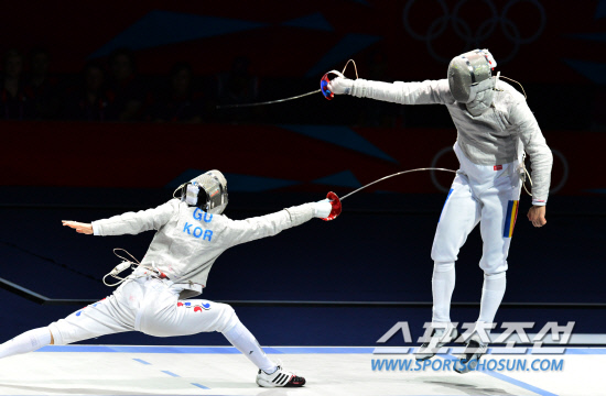 한국 남자 사브르 대표팀 구본길이 4일 새벽(한국시간) 영국 런던 엑셀 경기장에서 열린 2012 런던올림픽 남자 단체전 결승전에서 루마니아 선수를 공격하고 있다.