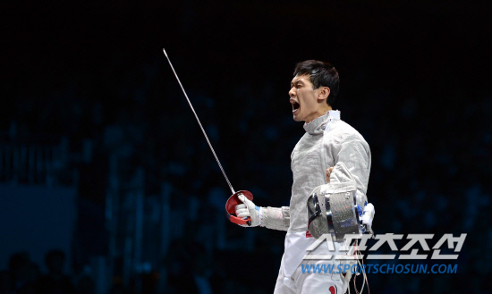 3일 영국 엑셀 런던 사우스 아레나에서 열린 런던올림픽 펜싱 남자단체 사브르 한국과 루마니아와의 결승에서 한국의 구본길 선수가 공격을 성공시킨뒤 환호하고 있다./20120803런던=올림픽사진공동취재단g