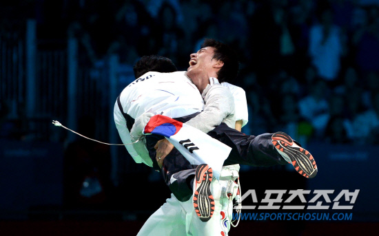 3일 영국 엑셀 런던 사우스 아레나에서 열린 런던올림픽 펜싱 남자단체 사브르 한국과 루마니아와의 결승에서 한국선수들이 원우영 선수가 금메달을 확정짓는 공격을 성공시킨뒤 감독을 안아들고 있다./20120803런던=올림픽사진공동취재단g