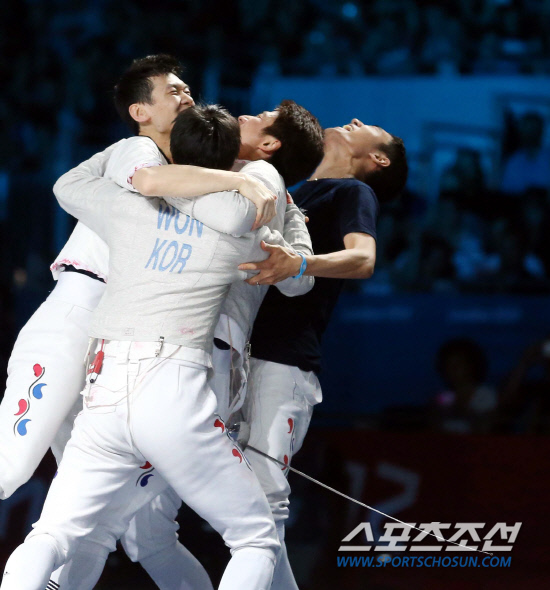 한국 남자 펜싱 사브르 대표팀 선수들이 4일 영국 런던 사우스 아레나에서 열린 2012 런던올림픽에서 단체전을 승리한후 환호하고있다..