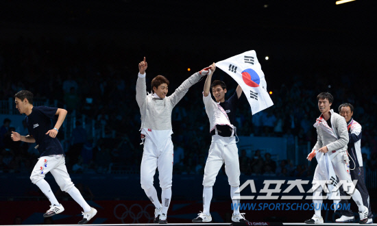 3일 영국 엑셀 런던 사우스 아레나에서 열린 런던올림픽 펜싱 남자단체 사브르 한국과 루마니아와의 결승에서 한국선수들이 원우영 선수가 금메달을 확정짓는 공격을 성공시키자 태극기를 들고 환호하고 있다./20120803런던=올림픽사진공동취재단g