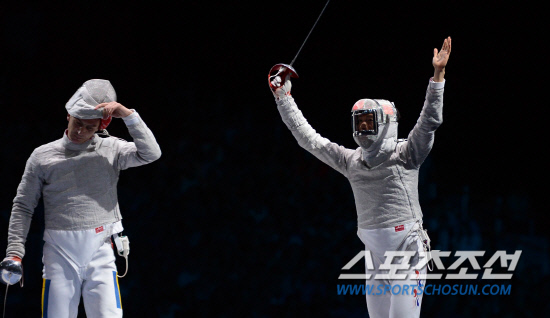 3일 영국 엑셀 런던 사우스 아레나에서 열린 런던올림픽 펜싱 남자단체 사브르 한국과 루마니아와의 결승에서 한국의 원우영 선수가 공격을 성공시킨뒤 환호하고 있다./20120803런던=올림픽사진공동취재단g