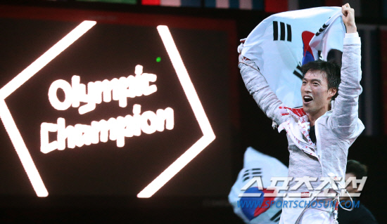 3일오후(현지시각) 영국 런던 엑셀 노스아레나2에서 열린 펜싱 남자 사브르 단체 결승전에서 한국(구본길 김정환 원우영 오은석)이 45:26 압도적인 점수차로 루마니아를 누르고 동·하계 올림픽 통산 100번째 금메달을 획득했다. 원우영이 태극기를 들고 환호하고 있다. 20120803 런던=올림픽사진공동취재단m
