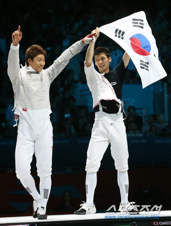 3일오후(현지시각) 영국 런던 엑셀 노스아레나2에서 열린 펜싱 남자 사브르 단체 결승전에서 한국(구본길 김정환 원우영 오은석)이 45:26 압도적인 점수차로 루마니아를 누르고 동·하계 올림픽 통산 100번째 금메달을 획득했다. 오은석(왼쪽), 구본길이 태극기를 들고 환호하고 있다. 20120803 런던=올림픽사진공동취재단m