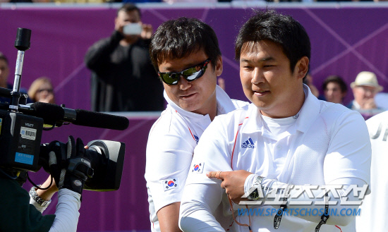 3일 오후(현지시간) 런던 로즈 크리켓 그라운드에서 열린 남자 양궁 개인전에서 금메달을 딴 오진혁 선수가 중계 카메라에 태극기를 가리키며 승리의 순간을 누리고 있다.20120803런던=올림픽사진공동취재단L