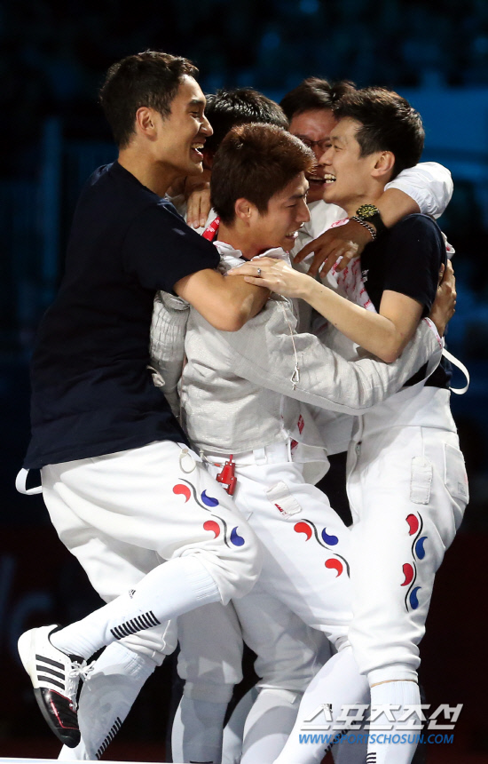 남자 단체 사브르 대표팀이 3일(현지시간) 오후 영국 런던 엑셀 경기장에서 열린 2012 런던올림픽 남자 사브르 단체전 결승전에서 루마니아팀을 이겨 사상 처음으로 올림픽 단체전 결승전에서 루마니아에 45-26으로 승리를 거둔후 환호하고 있다.
