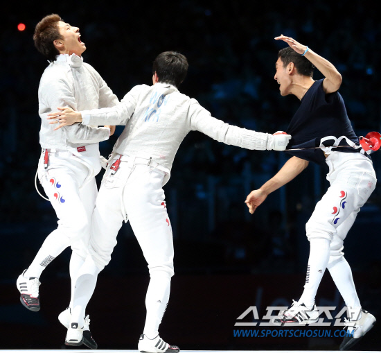 남자 단체 사브르 대표팀이 3일(현지시간) 오후 영국 런던 엑셀 경기장에서 열린 2012 런던올림픽 남자 사브르 단체전 결승전에서 루마니아팀을 이겨 사상 처음으로 올림픽 단체전 결승전에서 루마니아에 45-26으로 승리를 거둔후 환호하고 있다.