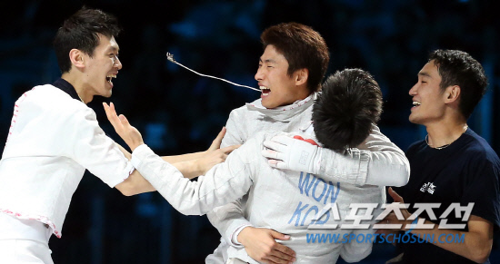 남자 단체 사브르 대표팀이 3일(현지시간) 오후 영국 런던 엑셀 경기장에서 열린 2012 런던올림픽 남자 사브르 단체전 결승전에서 루마니아팀을 이겨 사상 처음으로 올림픽 단체전 결승전에서 루마니아에 45-26으로 승리를 거둔후 환호하고 있다.