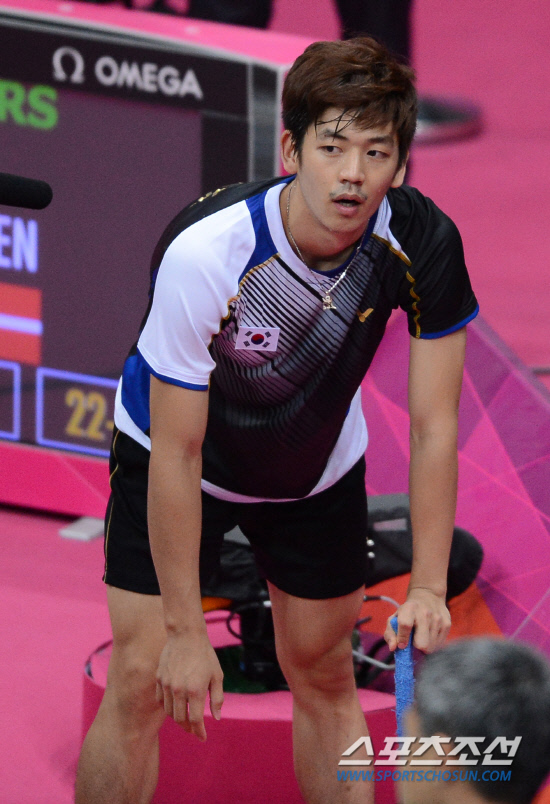 배드민턴 남자복식 이용대-정재성조는 4일 영국 런던 웸블리 아레나에서 열린 배드민턴 4강전에서 텐마크의 마티아스보-카르스텐 모겐센에게 세트스코어 1-2(21-17,18-21,20-21)로 패해 결승 진출이 좌절?榮? 이용대 선수가 허탈해하고있다