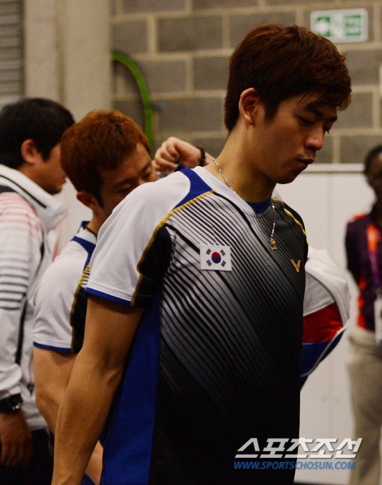 배드민턴 남자복식 이용대-정재성조는 4일 영국 런던 웸블리 아레나에서 열린 배드민턴 4강전에서 텐마크의 마티아스보-카르스텐 모겐센에게 세트스코어 1-2(21-17,18-21,20-21)로 패해 결승 진출이 좌절?榮? 이용대,정재성 선수가 심각한 표정으로 퇴장하고있다