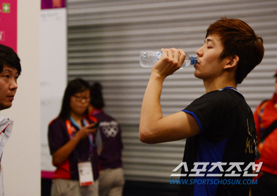 배드민턴 남자복식 이용대-정재성조는 4일 영국 런던 웸블리 아레나에서 열린 배드민턴 4강전에서 텐마크의 마티아스보-카르스텐 모겐센에게 세트스코어 1-2(21-17,18-21,20-21)로 패해 결승 진출이 좌절?榮? 이용대 선수가 포카리 스위트를 마시고있다