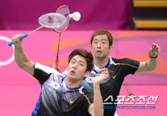 배드민턴 남자복식 이용대-정재성조는 4일 영국 런던 웸블리 아레나에서 열린 배드민턴 4강전에서 텐마크의 마티아스보-카르스텐 모겐센에게 세트스코어 1-2(21-17,18-21,20-21)로 패해 결승 진출이 좌절?榮? 정재성 선수가 공격을 하고있다