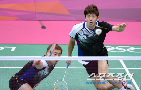 배드민턴 남자복식 이용대-정재성조는 4일 영국 런던 웸블리 아레나에서 열린 배드민턴 4강전에서 텐마크의 마티아스보-카르스텐 모겐센에게 세트스코어 1-2(21-17,18-21,20-21)로 패해 결승 진출이 좌절?榮?정재성 선수가 공격을 하고있다