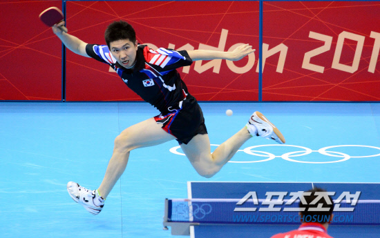 4일 오전(현지시간) 엑셀 노스아레나 경기장에서 열린 런던 올림픽 남자탁구 단체전 1라운드 북한과의 경기에서 유승민이 북한의 김혁봉을 상대로 볼을 넘기고 있다. 한국이 게임스코어 3-1로 승리했다. 20120804. 런던=올림픽사진공동취재단E