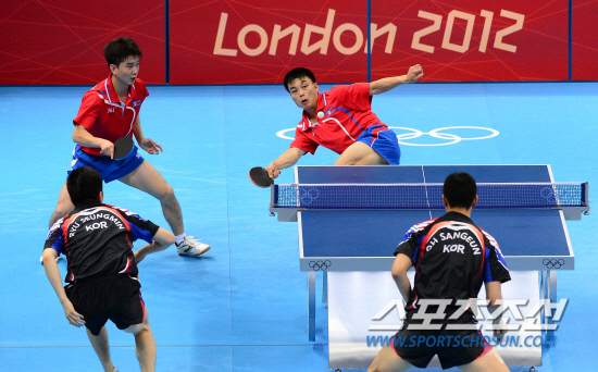 4일 오전(현지시간) 엑셀 노스아레나 경기장에서 열린 런던 올림픽 남자탁구 단체전 1라운드 북한과의 경기에서 오상은 유승민이 북한의 장성만 김성남과의 복식경기 하고 있다. 한국이 게임스코어 3-1로 역전승했다. 20120804. 런던=올림픽사진공동취재단E
