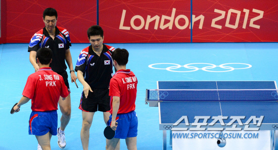 4일 오전(현지시간) 엑셀 노스아레나 경기장에서 열린 런던 올림픽 남자탁구 단체전 1라운드 북한과의 경기에서 오상은 유승민이 북한의 장성만 김성남과의 복식경기를 승리로 이끌고 악수하고 있다. 한국이 게임스코어 3-1로 역전승했다. 20120804. 런던=올림픽사진공동취재단E