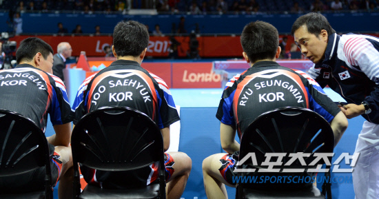 4일 오전(현지시간) 런던 엑셀에 위치한 올림픽 탁구 경기장에서 오상은과 주세혁, 유승민으로 구성된 한국 남자탁구팀이 단체전 첫 경기에서 접전 끝에 북한을 누루고 8강에 진출했다.유남규 감독이 선수들에게 지시사항을 전달하고 있다.