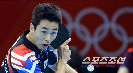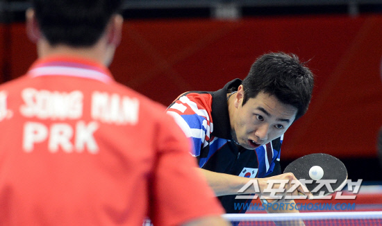 4일 오전(현지시간) 런던 엑셀에 위치한 올림픽 탁구 경기장에서 오상은과 주세혁, 유승민으로 구성된 한국 남자탁구팀이 단체전 첫 경기에서 접전 끝에 북한을 누르고 8강에 진출했다. 주세혁 선수가 북한의 장성만 선수와의 경기에서 공격을 하고 있다.