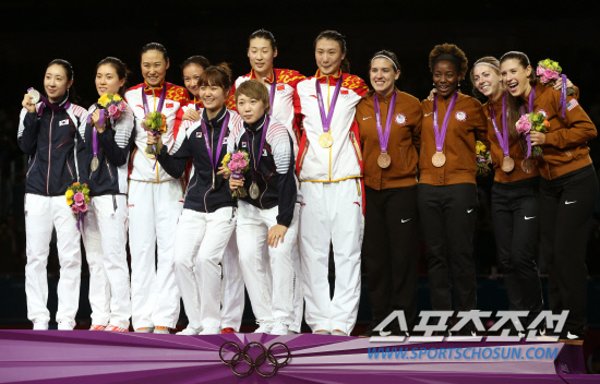 4일오후(현지시각) 영국 런던 엑셀 노스아레나2에서 열린 펜싱 여자 에페 단체 결승전에서 중국에 아깝게 패해 은메달을 획득한 한국(최인정, 정효정, 신아람, 최은숙)이 중국(금), 미국(동) 선수들과 기념촬영을 하고 있다. 20120804 런던=올림픽사진공동취재단m